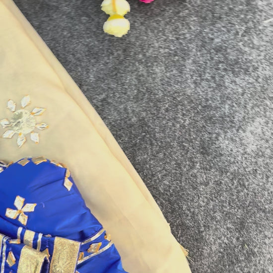 Introducing our Gangor Special exclusive launch crafted in pure tissue fabric that drapes beautifully while remaining lightweight and breathable for summer functions. The saree features intricate and finely detailed gotta patti work spread elegantly across the entire drape. Inspired by traditional festive artistry, it carries a royal charm perfect for weddings and cultural celebrations. The golden border and tassel detailing enhance its rich appearance. Paired with a heavy malai silk stitched blouse featuring elegant gotta patti lace work in the front, this set delivers complete festive perfection.